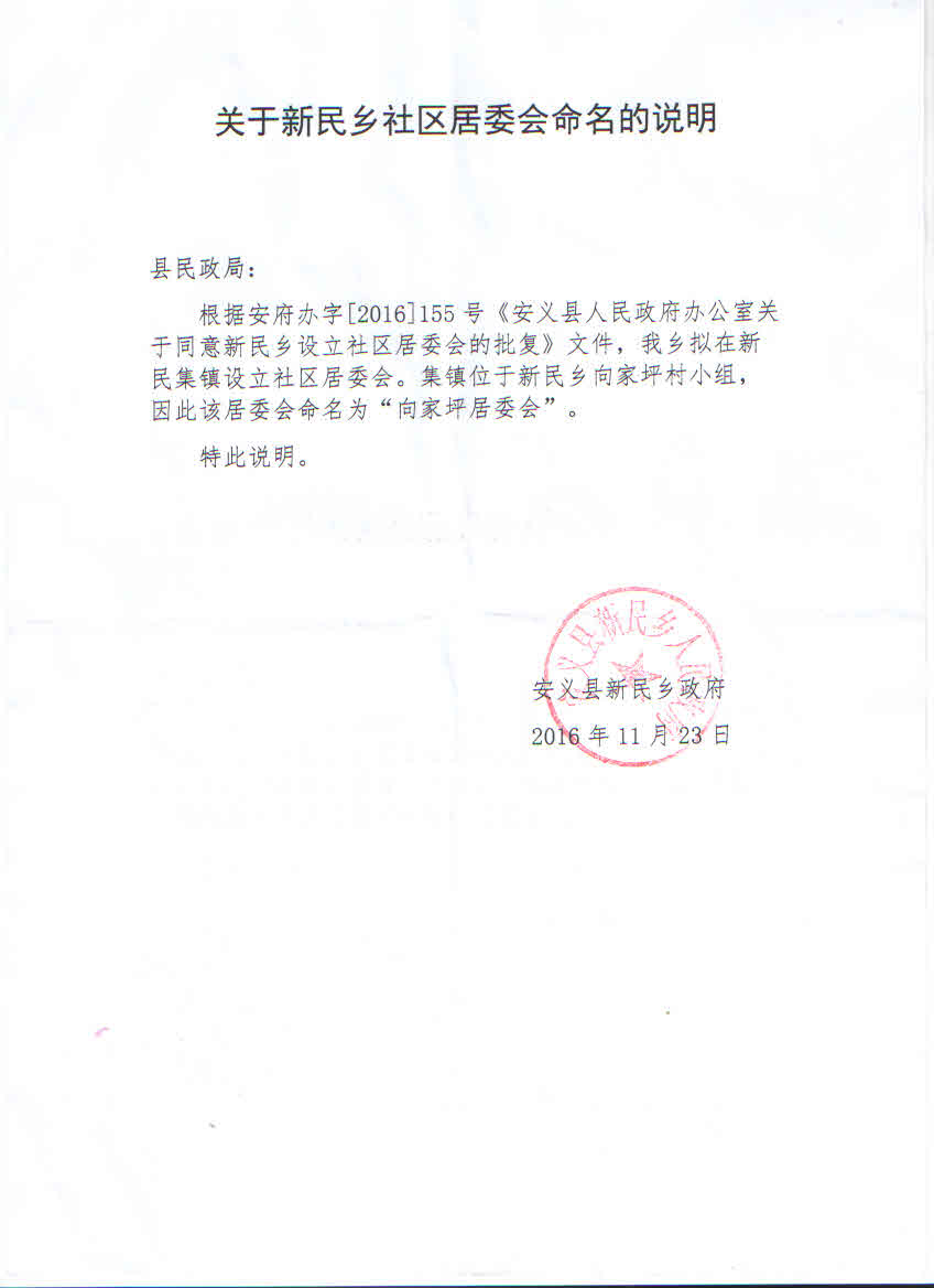 关于同意新民乡社区居委会命名的说明